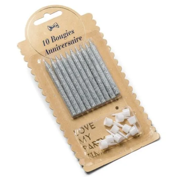 La Bougie Anniversaire Argent Pailletée Est Vendue En Lot De 10 A Prix Discount Avec Une Dimension De 6Cm Et Ses Bobeches