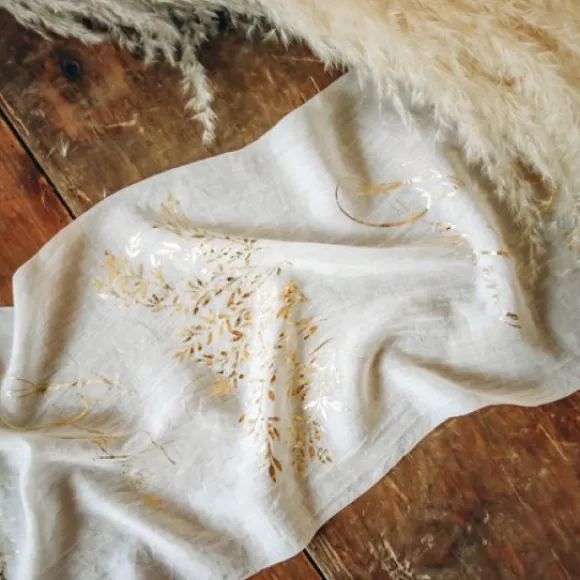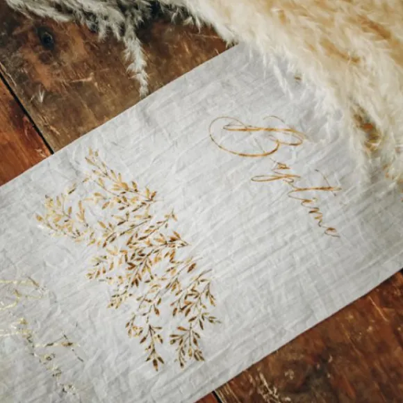 Le Chemin De Table Baptême Liseré Végétal Or A Une Matiere Toute Douce En Mousseline Froissée
