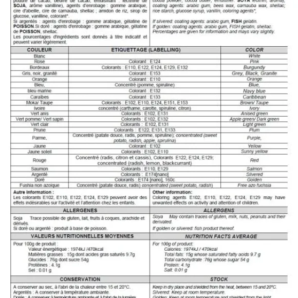 Composition : Sucre, Chocolat (Pâte De Cacao, Poudre De Cacao, Beurre De Cacao, Lécithine De Soja, Arôme), Glucose, Gomme Arabique, Agents D’Enrobage (Shellac, Cire De Carnauba, Cire D’Abeillle)