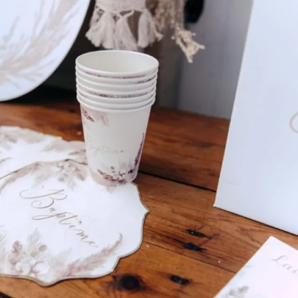 Un Lot De 8 Gobelet Carton Imprimé Du Mot Baptême Et Accompagné De Son Theme Fleurs De Coton