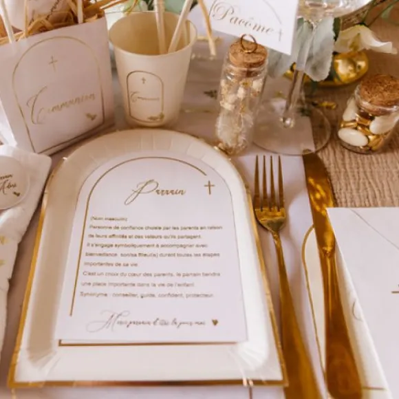 Un Lot De 8 Gobelet Carton Imprimé Du Mot Communion Doré Et Accompagné De Son Theme Pureté Blanc