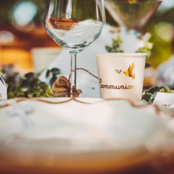 Un Lot De 8 Gobelet Carton Imprimé Du Mot Communion Doré Et Accompagné De Son Theme Vegetal Vert Et Colombes