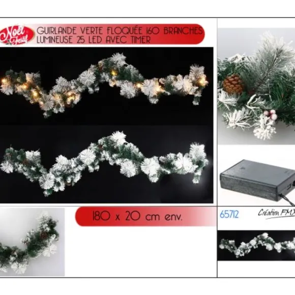 Guirlande Verte Floqué Lumineuse 25 Led Avec Houes Et Pomme De Pin- L1M80 Env X Largeur 20Cm Env – Timer (6H On /18H Off)- Blanc Chaud – 3 Piles Aa Iles Non Incluses – Intérieur – – Pvc