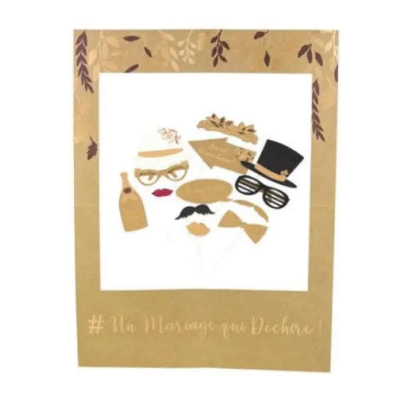 Ce Kit Photobooth Kraft Bronze Avec Cadre Géant Comprend 13 Accessoires Ainsi Q’Un Grand Cadre 57.5 X 80 Cm, Parfait Pour Un Garder Un Joli Souvenir