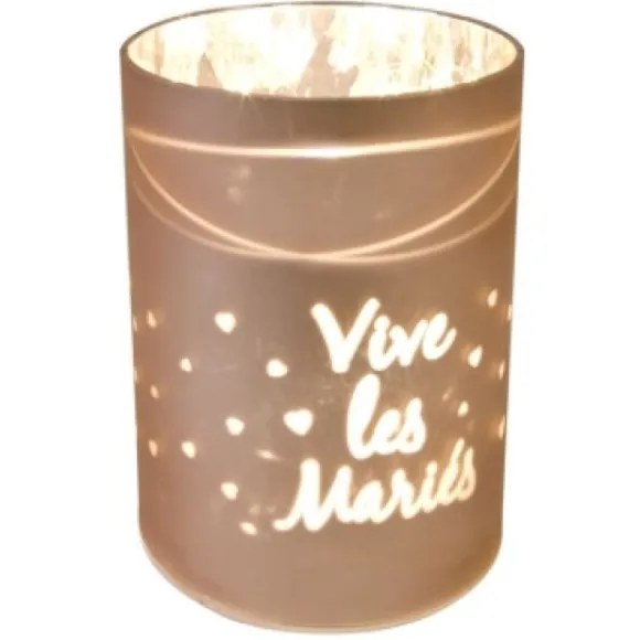 Le Photophore Vive Les Mariés Rose Gold Avec Sa Bougie Led Incluse Apportera Une Touche D’Èlègance A Vos Buffets Et Tables , C’Est Un Photophore Mariage Imprimés Vive Les Maries Avec Ses Jolis Petits Coeurs Autour