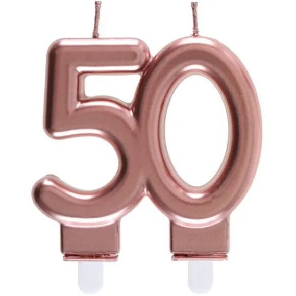 Choisissez La Bougie Anniversaire 50 Ans Rose Gold, Une Bougie Anniversaire Pour 50 Ans Couleur Rose Gold Sur Double Piques En Parrafine Et Plastique Avec Son Effet Blush Brillant