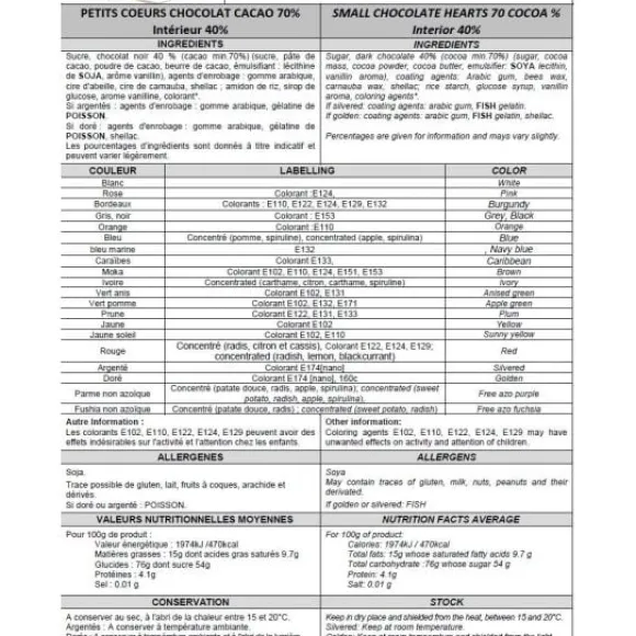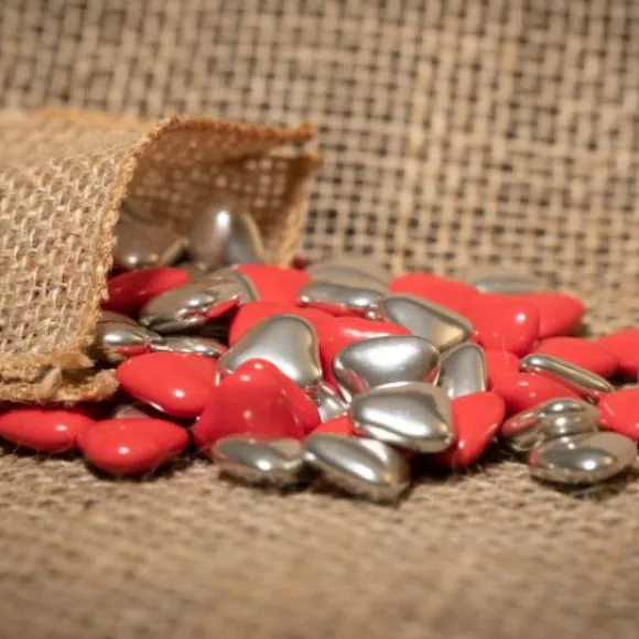 Les Dragées Coeur Chocolat Assorti Rouge Et Argent Sont De Fabrication Française Et Sont Composés De Chocolat : 70% De Cacao Moulé Et Enrobés D’Une Très Riche Palette De Sucres Colorés.