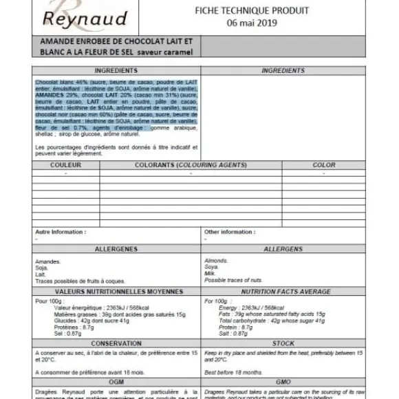 Chocolat Blanc 46% (Sucre, Beurre De Cacao, Poudre De Lait Entier, Émulsifiant : Lécithine De Soja, Arôme Naturel De Vanille), Amandes 29%, Chocolat Lait 20% (Cacao Min 31%) (Sucre, Beurre De Cacao, Lait Entier En Poudre, Pâte De Cacao, Émulsifiant : Lécithine De Soja, Arôme Naturel De Vanille), Sucre, Chocolat Noir (Cacao Min 60%) (Pâte De Cacao, Sucre, Beurre De Cacao, Émulsifiant : Lécithine De Soja, Arôme Naturel De Vanille), Fleur De Sel 0.7%, Agents D’Enrobage :