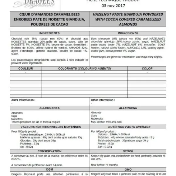 Chocolat Noir 38% (Cacao Min 60%) Et Chocolat Aux Noisettes Gianduja 26% (Pâte De Cacao, Sucre, Pâte De Noisette 7%, Noisette 6%, Beurre De Cacao, Émulsifiant : Lécithine De Soja, Arôme Naturel De Vanille), Amande 32%, Agent D’Enrobage : Gomme Arabique, Poudre De Cacao 1%, Sucre.