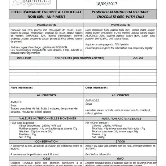 Chocolat Noir 65% (Cacao Min 60%) (Pâte De Cacao, Sucre, Beurre De Cacao, Émulsifiant : Lécithine De Soja, Arôme Naturel De Vanille), Amandes 32%, Agents D’Enrobage : Gomme Arabique ; Sucre, Poudre De Cacao, Piment (0.6%), Arôme Naturel De Piment.