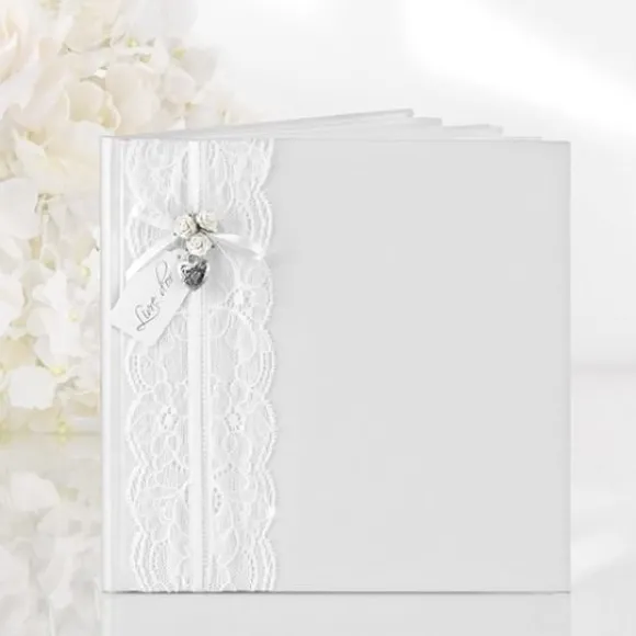 Accordez Le Livre D’Or Avec Dentelle Blanche À Notre Large Choix D’Accessoires Indispensables Pour Votre Mariage :Urne, Coussin Porte Alliance..