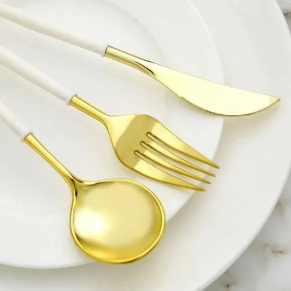 La Ménagère Plastique Réutilisable Gourmet Or Est Vendue En Lot De 18 Pièces Comprenant : 6 Fourchettes, 6 Cuilleres , Et 6 Couteaux Couleur Or Et Blanc