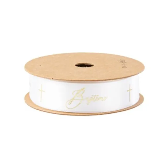 Le Ruban Satin Baptême Croix Blanc Et Or Est Vendu A L’Unité A Prix Discount Et Mesure 1.9Cm De Large Sur 10 Mètres De Long