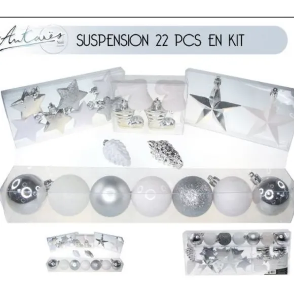 Choisissez Ce Lot De Suspensions Pour Sapin De Noel Blanc Argent X 22 Pièces, Ce Kit De Décoration Pour Sapin De Noel Comprend Des Boules De Noel, Des Suspensions De Sapin Originales : Bottes, Etoiles Et Pommes De Pin Dans Les Tons Blanc Et Argent